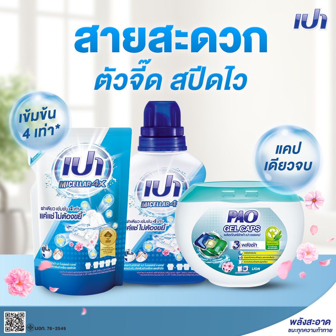 - จัดการงานซักให้รวดเร็วด้วยสูตรเข้มข้น แค่ 1 ฝาก็เข้มข้น 4 เท่า* อย่าง “เปา ไมเซลลาร์ 4X”